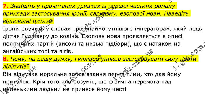 7. Знайдіть у прочитаних уривках із першої частини роману приклади застосування іронії, сарказму, езопової мови. Наведіть відповідні цитати. Іронія звучить у словах про «наймогутнішого імператора», який ледь дістає Гулліверу до коліна. Езопова мова проявляється в описі політичних партій (високі та низькі підбори), що є натяком на англійських торі та вігів. 8. Чому, на вашу думку, Гуллівер уникав застосовувати силу проти ліліпутів? Він відчував моральне зобов’язання перед тими, хто дав йому притулок. Крім того, він розумів, що фізична перемога над маленькими людьми не принесе йому честі.
