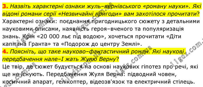 3. Назвіть характерні ознаки жуль–вернівського «роману науки». Які відомі романи серії «Незвичайні пригоди» вам захотілося прочитати? Характерні ознаки: поєднання пригодницького сюжету з детальними науковими описами, наявність героя–вченого та популяризація знань. Крім «20 000 льє під водою», хочеться прочитати «Діти капітана Гранта» та «Подорож до центру Землі». 4. Поясніть, що таке науково–фантастичний роман. Які наукові передбачення нале–І жать Жулю Верну? Це твір, де сюжет будується на основі наукових гіпотез про речі, які ще не існують. Передбачення Жуля Верна: підводний човен, космічний апарат, гелікоптер, відеозв'язок та електричний стілець.