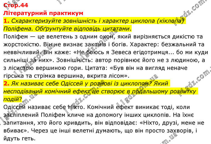 Літературний практикум 1. Схарактеризуйте зовнішність і характер циклопа (кіклопа) Поліфема. Обґрунтуйте відповідь цитатами. Поліфем — це велетень з одним оком, який вирізняється дикістю та жорстокістю. Він не визнає законів і богів. Характер: безжальний та неввічливий. Він каже: «Не боюсь я Зевеса егідотримця... бо ми куди сильніші за них». Зовнішність: автор порівнює його не з людиною, а з лісистою вершиною гори. Цитата: «Був він на вигляд неначе гірська та стрімка вершина, вкрита лісом». 2. Як називає себе Одіссей у розмові із циклопом? Який несподіваний комічний ефект це створює в подальшому розвитку подій? Одіссей називає себе Ніхто. Комічний ефект виникає тоді, коли засліплений Поліфем кличе на допомогу інших циклопів. На їхнє запитання, хто його кривдить, він відповідає: «Ніхто, друзі, мене не вбиває». Через це інші велетні думають, що він просто захворів, і йдуть геть.