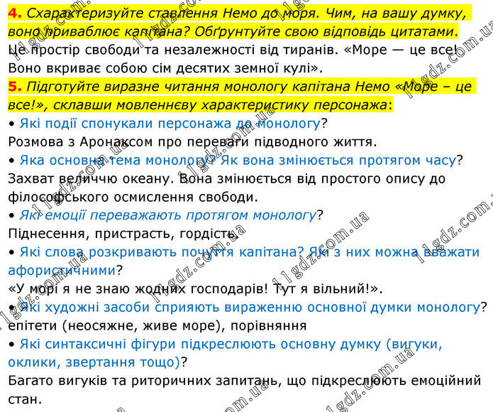4. Схарактеризуйте ставлення Немо до моря. Чим, на вашу думку, воно приваблює капітана? Обґрунтуйте свою відповідь цитатами. Це простір свободи та незалежності від тиранів. «Море — це все! Воно вкриває собою сім десятих земної кулі». 5. Підготуйте виразне читання монологу капітана Немо «Море – це все!», склавши мовленнєву характеристику персонажа: • Які події спонукали персонажа до монологу? Розмова з Аронаксом про переваги підводного життя. • Яка основна тема монологу? Як вона змінюється протягом часу? Захват величчю океану. Вона змінюється від простого опису до філософського осмислення свободи. • Які емоції переважають протягом монологу? Піднесення, пристрасть, гордість. • Які слова розкривають почуття капітана? Які з них можна вважати афористичними? «У морі я не знаю жодних господарів! Тут я вільний!». • Які художні засоби сприяють вираженню основної думки монологу? епітети (неосяжне, живе море), порівняння • Які синтаксичні фігури підкреслюють основну думку (вигуки, оклики, звертання тощо)? Багато вигуків та риторичних запитань, що підкреслюють емоційний стан.