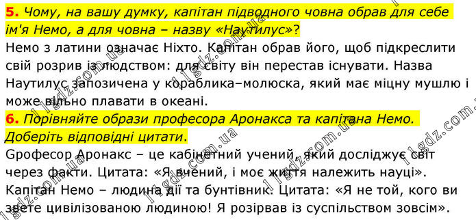 5. Чому, на вашу думку, капітан підводного човна обрав для себе ім'я Немо, а для човна – назву «Наутилус»? Немо з латини означає Ніхто. Капітан обрав його, щоб підкреслити свій розрив із людством: для світу він перестав існувати. Назва Наутилус запозичена у кораблика–молюска, який має міцну мушлю і може вільно плавати в океані. 6. Порівняйте образи професора Аронакса та капітана Немо. Доберіть відповідні цитати. Професор Аронакс – це кабінетний учений, який досліджує світ через факти. Цитата: «Я вчений, і моє життя належить науці». Капітан Немо – людина дії та бунтівник. Цитата: «Я не той, кого ви звете цивілізованою людиною! Я розірвав із суспільством зовсім».