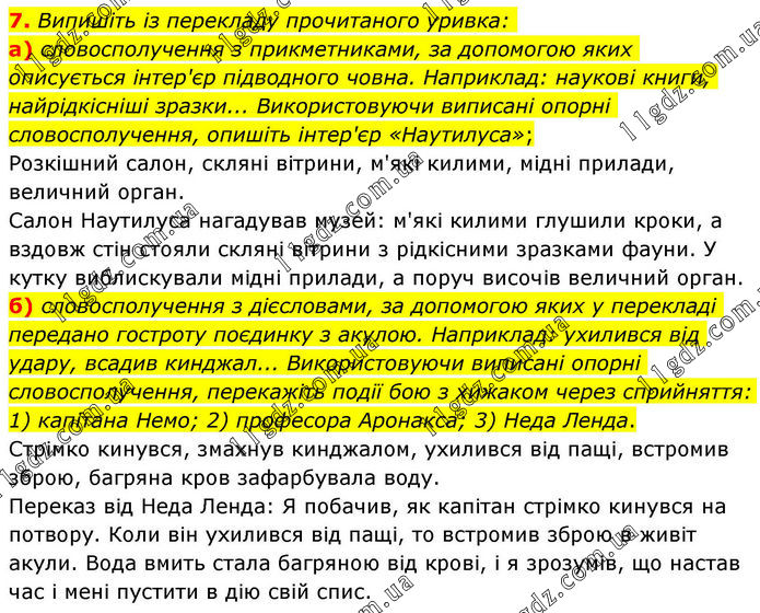 7. Випишіть із перекладу прочитаного уривка: а) словосполучення з прикметниками, за допомогою яких описується інтер'єр підводного човна. Наприклад: наукові книги, найрідкісніші зразки... Використовуючи виписані опорні словосполучення, опишіть інтер'єр «Наутилуса»; Розкішний салон, скляні вітрини, м'які килими, мідні прилади, величний орган. Салон Наутилуса нагадував музей: м'які килими глушили кроки, а вздовж стін стояли скляні вітрини з рідкісними зразками фауни. У кутку виблискували мідні прилади, а поруч височів величний орган. б) словосполучення з дієсловами, за допомогою яких у перекладі передано гостроту поєдинку з акулою. Наприклад: ухилився від удару, всадив кинджал... Використовуючи виписані опорні словосполучення, перекажіть події бою з хижаком через сприйняття: 1) капітана Немо; 2) професора Аронакса; 3) Неда Ленда. Стрімко кинувся, змахнув кинджалом, ухилився від пащі, встромив зброю, багряна кров зафарбувала воду. Переказ від Неда Ленда: Я побачив, як капітан стрімко кинувся на потвору. Коли він ухилився від пащі, то встромив зброю в живіт акули. Вода вмить стала багряною від крові, і я зрозумів, що настав час і мені пустити в дію свій спис.
