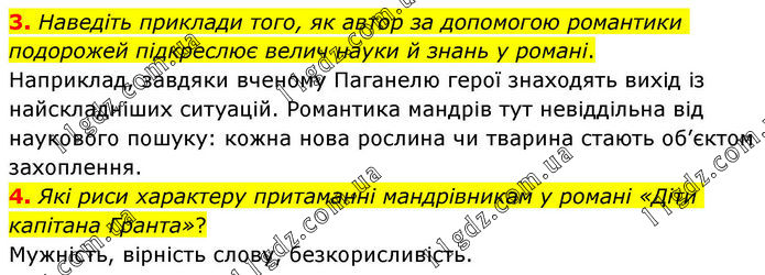 3. Наведіть приклади того, як автор за допомогою романтики подорожей підкреслює велич науки й знань у романі. Наприклад, завдяки вченому Паганелю герої знаходять вихід із найскладніших ситуацій. Романтика мандрів тут невіддільна від наукового пошуку: кожна нова рослина чи тварина стають об’єктом захоплення. 4. Які риси характеру притаманні мандрівникам у романі «Діти капітана Гранта»? Мужність, вірність слову, безкорисливість.