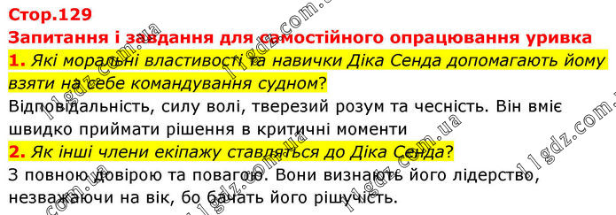 Запитання і завдання для самостійного опрацювання уривка 1. Які моральні властивості та навички Діка Сенда допомагають йому взяти на себе командування судном? Відповідальність, силу волі, тверезий розум та чесність. Він вміє швидко приймати рішення в критичні моменти 2. Як інші члени екіпажу ставляться до Діка Сенда? З повною довірою та повагою. Вони визнають його лідерство, незважаючи на вік, бо бачать його рішучість.