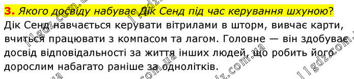 3. Якого досвіду набуває Дік Сенд під час керування шхуною? Дік Сенд навчається керувати вітрилами в шторм, вивчає карти, вчиться працювати з компасом та лагом. Головне — він здобуває досвід відповідальності за життя інших людей, що робить його дорослим набагато раніше за однолітків.