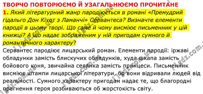 ТВОРЧО ПОВТОРЮЄМО Й УЗАГАЛЬНЮЄМО ПРОЧИТАНЕ 1. Який літературний жанр пародіюється в романі «Премудрий гідальго Дон Кіхот з Ламанчі» Сервантеса? Визначте елементи пародії в цьому творі. Що саме й чому висміює письменник у цій книжці? А що надає зображеним у ній пригодам сумного й романтичного характеру? Сервантес пародіює лицарський роман. Елементи пародії: іржаві обладунки замість блискучих обладунків, худа шкапа замість бойового коня, звичайна селянка замість принцеси. Письменник висміює штампи лицарської літератури, бо вони відривали людей від реальності. Сумного характеру пригодам надає те, що благородні прагнення героя розбиваються об жорстокість світу.