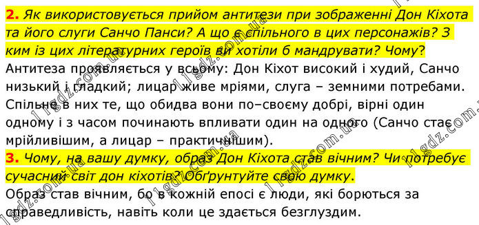 2. Як використовується прийом антитези при зображенні Дон Кіхота та його слуги Санчо Панси? А що є спільного в цих персонажів? З ким із цих літературних героїв ви хотіли б мандрувати? Чому? Антитеза проявляється у всьому: Дон Кіхот високий і худий, Санчо низький і гладкий; лицар живе мріями, слуга – земними потребами. Спільне в них те, що обидва вони по–своєму добрі, вірні один одному і з часом починають впливати один на одного (Санчо стає мрійливішим, а лицар – практичнішим). 3. Чому, на вашу думку, образ Дон Кіхота став вічним? Чи потребує сучасний світ дон кіхотів? Обґрунтуйте свою думку. Образ став вічним, бо в кожній епосі є люди, які борються за справедливість, навіть коли це здається безглуздим.