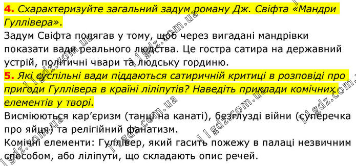 4. Схарактеризуйте загальний задум роману Дж. Свіфта «Мандри Гуллівера». Задум Свіфта полягав у тому, щоб через вигадані мандрівки показати вади реального людства. Це гостра сатира на державний устрій, політичні чвари та людську гординю. 5. Які суспільні вади піддаються сатиричній критиці в розповіді про пригоди Гуллівера в країні ліліпутів? Наведіть приклади комічних елементів у творі. Висміюються кар’єризм (танці на канаті), безглузді війни (суперечка про яйця) та релігійний фанатизм. Комічні елементи: Гуллівер, який гасить пожежу в палаці незвичним способом, або ліліпути, що складають опис речей.