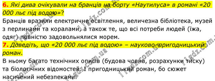 6. Які дива очікували на бранців на борту «Наутилуса» в романі «20 000 льє під водою»? Бранців вразили електричне освітлення, величезна бібліотека, музей з перлинами та коралами, а також те, що всі потреби людей (їжа, одяг) повністю задовольнялися морем. 7. Доведіть, що «20 000 льє під водою» – науково–пригодницький роман. В ньому багато технічних описів (будова човна, розрахунки тиску) та біологічних відомостей. І пригодницький роман, бо сюжет насичений небезпеками.