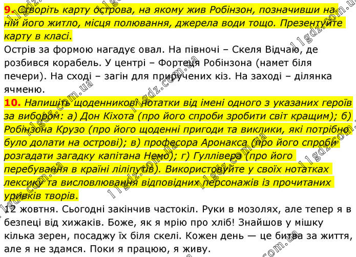 9. Створіть карту острова, на якому жив Робінзон, позначивши на ній його житло, місця полювання, джерела води тощо. Презентуйте карту в класі. Острів за формою нагадує овал. На півночі – Скеля Відчаю, де розбився корабель. У центрі – Фортеця Робінзона (намет біля печери). На сході – загін для приручених кіз. На заході – ділянка ячменю. 10. Напишіть щоденникові нотатки від імені одного з указаних героїв за вибором: а) Дон Кіхота (про його спроби зробити світ кращим); б) Робінзона Крузо (про його щоденні пригоди та виклики, які потрібно було долати на острові); в) професора Аронакса (про його спроби розгадати загадку капітана Немо); г) Гуллівера (про його перебування в країні ліліпутів). Використовуйте у своїх нотатках лексику та висловлювання відповідних персонажів із прочитаних уривків творів. 12 жовтня. Сьогодні закінчив частокіл. Руки в мозолях, але тепер я в безпеці від хижаків. Боже, як я мрію про хліб! Знайшов у мішку кілька зерен, посаджу їх біля скелі. Кожен день — це битва за життя, але я не здамся. Поки я працюю, я живу.
