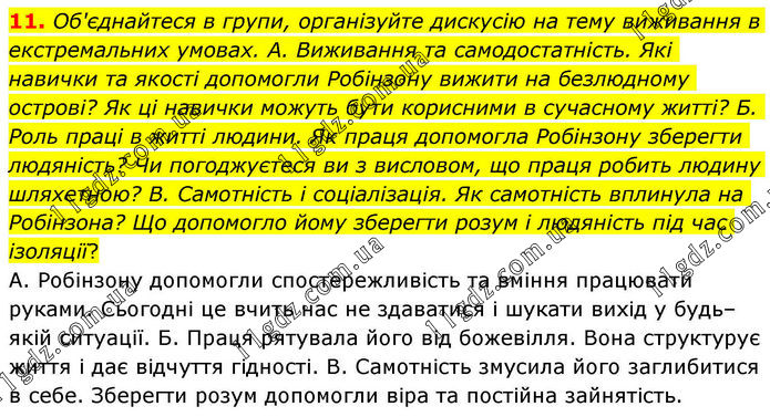 11. Об'єднайтеся в групи, організуйте дискусію на тему виживання в екстремальних умовах. А. Виживання та самодостатність. Які навички та якості допомогли Робінзону вижити на безлюдному острові? Як ці навички можуть бути корисними в сучасному житті? Б. Роль праці в житті людини. Як праця допомогла Робінзону зберегти людяність? Чи погоджуєтеся ви з висловом, що праця робить людину шляхетною? В. Самотність і соціалізація. Як самотність вплинула на Робінзона? Що допомогло йому зберегти розум і людяність під час ізоляції? А. Робінзону допомогли спостережливість та вміння працювати руками. Сьогодні це вчить нас не здаватися і шукати вихід у будь–якій ситуації. Б. Праця рятувала його від божевілля. Вона структурує життя і дає відчуття гідності. В. Самотність змусила його заглибитися в себе. Зберегти розум допомогли віра та постійна зайнятість.