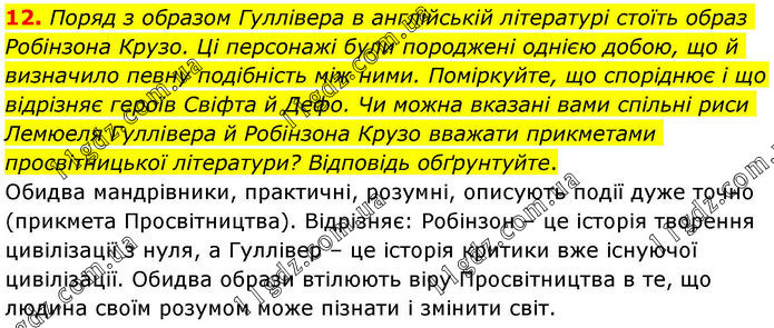 12. Поряд з образом Гуллівера в англійській літературі стоїть образ Робінзона Крузо. Ці персонажі були породжені однією добою, що й визначило певну подібність між ними. Поміркуйте, що споріднює і що відрізняє героїв Свіфта й Дефо. Чи можна вказані вами спільні риси Лемюеля Гуллівера й Робінзона Крузо вважати прикметами просвітницької літератури? Відповідь обґрунтуйте. Обидва мандрівники, практичні, розумні, описують події дуже точно (прикмета Просвітництва). Відрізняє: Робінзон – це історія творення цивілізації з нуля, а Гуллівер – це історія критики вже існуючої цивілізації. Обидва образи втілюють віру Просвітництва в те, що людина своїм розумом може пізнати і змінити світ.
