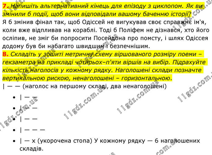 7. Напишіть альтернативний кінець для епізоду з циклопом. Як ви змінили б події, щоб вони відповідали вашому баченню історії? Я б змінив фінал так, щоб Одіссей не вигукував своє справжнє ім'я, коли вже відпливав на кораблі. Тоді б Поліфем не дізнався, хто його осліпив, не зміг би попросити Посейдона про помсту, і шлях Одіссея додому був би набагато швидшим і безпечнішим. 8. Складіть у зошиті метричну схему віршованого розміру поеми – гекзаметра на прикладі чотирьох–п'яти віршів на вибір. Підрахуйте кількість наголосів у кожному рядку. Наголошені склади позначте вертикальною рискою, ненаголошені – горизонтальною. | — — (наголос на першому складі, два ненаголошені) • | — — • | — — • | — — • | — — — • | — x (укорочена стопа) У кожному рядку — 6 наголошених складів.
