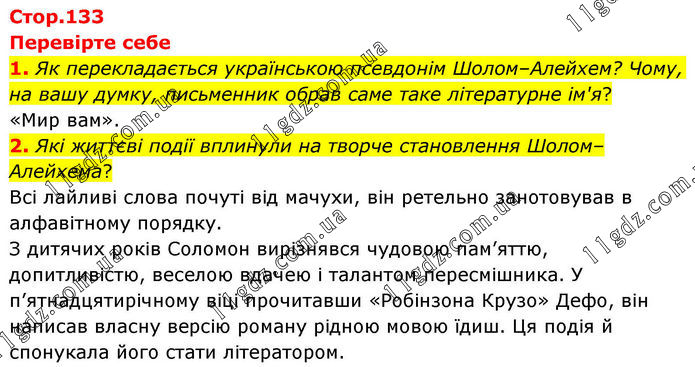 Перевірте себе 1. Як перекладається українською псевдонім Шолом–Алейхем? Чому, на вашу думку, письменник обрав саме таке літературне ім'я? «Мир вам». 2. Які життєві події вплинули на творче становлення Шолом–Алейхема? Всі лайливі слова почуті від мачухи, він ретельно занотовував в алфавітному порядку. З дитячих років Соломон вирізнявся чудовою пам’яттю, допитливістю, веселою вдачею і талантом пересмішника. У п’ятнадцятирічному віці прочитавши «Робінзона Крузо» Дефо, він написав власну версію роману рідною мовою їдиш. Ця подія й спонукала його стати літератором.