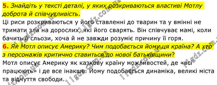 5. Знайдіть у тексті деталі, у яких розкриваються властиві Мотлу доброта й співчутливість. Ці риси розкриваються у його ставленні до тварин та у вмінні не тримати зла на дорослих, які його сварять. Він співчуває мамі, коли бачить її сльози, хоча й не завжди розуміє причину її горя. 6. Як Мотл описує Америку? Чим подобається йому ця країна? А хто з персонажів критично ставиться до нової батьківщини? Мотл описує Америку як казкову країну можливостей, де «всі працюють» і де все інакше. Йому подобається динаміка, великі міста та відчуття свободи.