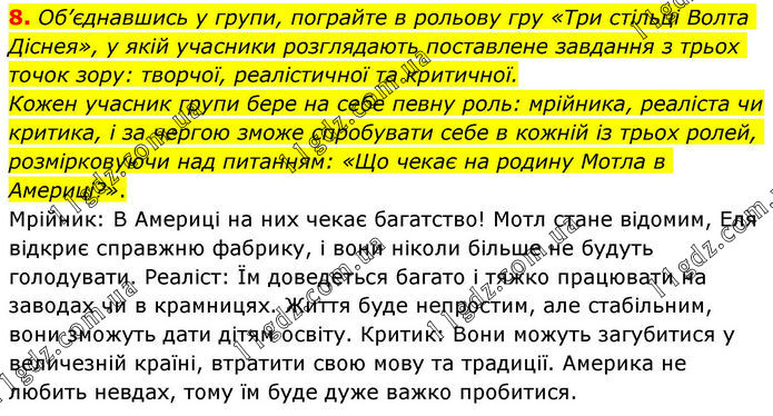 8. Об’єднавшись у групи, пограйте в рольову гру «Три стільці Волта Діснея», у якій учасники розглядають поставлене завдання з трьох точок зору: творчої, реалістичної та критичної. Кожен учасник групи бере на себе певну роль: мрійника, реаліста чи критика, і за чергою зможе спробувати себе в кожній із трьох ролей, розмірковуючи над питанням: «Що чекає на родину Мотла в Америці?». Мрійник: В Америці на них чекає багатство! Мотл стане відомим, Еля відкриє справжню фабрику, і вони ніколи більше не будуть голодувати. Реаліст: Їм доведеться багато і тяжко працювати на заводах чи в крамницях. Життя буде непростим, але стабільним, вони зможуть дати дітям освіту. Критик: Вони можуть загубитися у величезній країні, втратити свою мову та традиції. Америка не любить невдах, тому їм буде дуже важко пробитися.