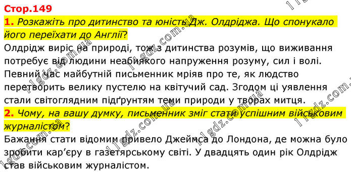 1. Розкажіть про дитинство та юність Дж. Олдріджа. Що спонукало його переїхати до Англії? Олдрідж виріс на природі, тож з дитинства розумів, що виживання потребує від людини неабиякого напруження розуму, сил і волі. Певний час майбутній письменник мріяв про те, як людство перетворить велику пустелю на квітучий сад. Згодом ці уявлення стали світоглядним підґрунтям теми природи у творах митця. 2. Чому, на вашу думку, письменник зміг стати успішним військовим журналістом? Бажання стати відомим привело Джеймса до Лондона, де можна було зробити кар’єру в газетярському світі. У двадцять один рік Олдрідж став військовим журналістом.