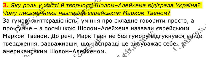 3. Яку роль у житті й творчості Шолом–Алейхема відіграла Україна? Чому письменника називали єврейським Марком Твеном? За гумор, життєрадісність, уміння про складне говорити просто, а про сумне – з посмішкою Шолом–Алейхема назвали єврейським Марком Твеном. До речі, Марк Твен не без гумору відгукнувся на це твердження, завваживши, що насправді це він уважає себе американським Шолом–Алейхемом.