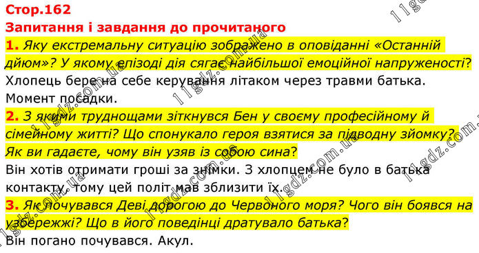 Запитання і завдання до прочитаного 1. Яку екстремальну ситуацію зображено в оповіданні «Останній дйюм»? У якому епізоді дія сягає найбільшої емоційної напруженості? Хлопець бере на себе керування літаком через травми батька. Момент посадки. 2. З якими труднощами зіткнувся Бен у своєму професійному й сімейному житті? Що спонукало героя взятися за підводну зйомку? Як ви гадаєте, чому він узяв із собою сина? Він хотів отримати гроші за знімки. З хлопцем не було в батька контакту, тому цей політ мав зблизити їх. 3. Як почувався Деві дорогою до Червоного моря? Чого він боявся на узбережжі? Що в його поведінці дратувало батька? Він погано почувався. Акул.