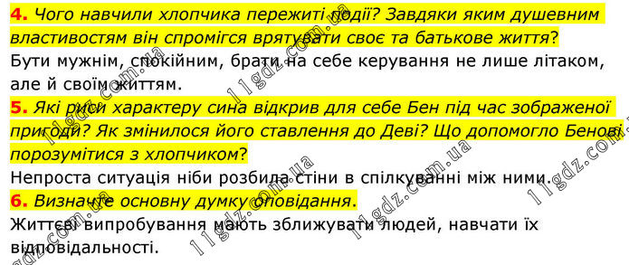 4. Чого навчили хлопчика пережиті події? Завдяки яким душевним властивостям він спромігся врятувати своє та батькове життя? Бути мужнім, спокійним, брати на себе керування не лише літаком, але й своїм життям. 5. Які риси характеру сина відкрив для себе Бен під час зображеної пригоди? Як змінилося його ставлення до Деві? Що допомогло Бенові порозумітися з хлопчиком? Непроста ситуація ніби розбила стіни в спілкуванні між ними. 6. Визначте основну думку оповідання. Життєві випробування мають зближувати людей, навчати їх відповідальності.