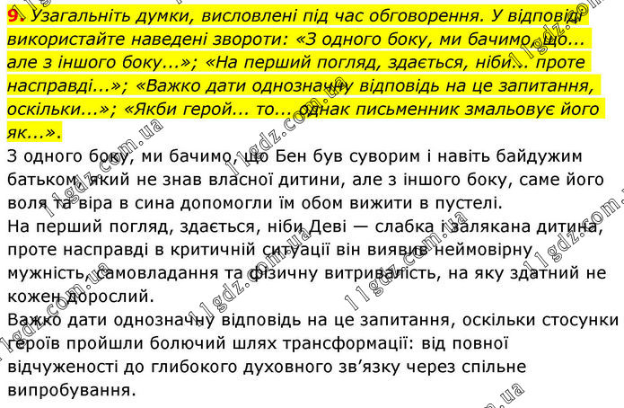 9. Узагальніть думки, висловлені під час обговорення. У відповіді використайте наведені звороти: «З одного боку, ми бачимо, що... але з іншого боку...»; «На перший погляд, здається, ніби... проте насправді...»; «Важко дати однозначну відповідь на це запитання, оскільки...»; «Якби герой... то... однак письменник змальовує його як...». З одного боку, ми бачимо, що Бен був суворим і навіть байдужим батьком, який не знав власної дитини, але з іншого боку, саме його воля та віра в сина допомогли їм обом вижити в пустелі. На перший погляд, здається, ніби Деві — слабка і залякана дитина, проте насправді в критичній ситуації він виявив неймовірну мужність, самовладання та фізичну витривалість, на яку здатний не кожен дорослий. Важко дати однозначну відповідь на це запитання, оскільки стосунки героїв пройшли болючий шлях трансформації: від повної відчуженості до глибокого духовного зв’язку через спільне випробування.