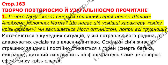 ТВОРЧО ПОВТОРЮЄМО Й УЗАГАЛЬНЮЄМО ПРОЧИТАНЕ 1. Із чого (або з кого) сміється головний герой повісті Шолом–Алейхема «Хлопчик Мотл»? Що надає цій усмішці характеру «сміху крізь сльози»? Чи залишається Мотл оптимістом, попри всі труднощі? Мотл сміється з кумедних ситуацій, у які потрапляє його родина, з дивакуватих сусідів та з власних витівок. Оскільки сім'я живе у страшних злиднях і постійно стикається з горем (смерть батька, еміграція), дитячий сміх звучить на фоні трагедії. Саме це створює ефект сміху крізь сльози.