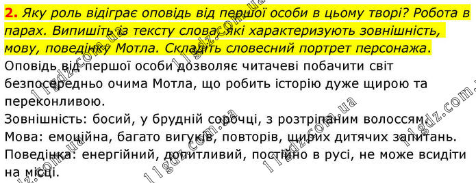 2. Яку роль відіграє оповідь від першої особи в цьому творі? Робота в парах. Випишіть із тексту слова, які характеризують зовнішність, мову, поведінку Мотла. Складіть словесний портрет персонажа. Оповідь від першої особи дозволяє читачеві побачити світ безпосередньо очима Мотла, що робить історію дуже щирою та переконливою. Зовнішність: босий, у брудній сорочці, з розтріпаним волоссям. Мова: емоційна, багато вигуків, повторів, щирих дитячих запитань. Поведінка: енергійний, допитливий, постійно в русі, не може всидіти на місці.