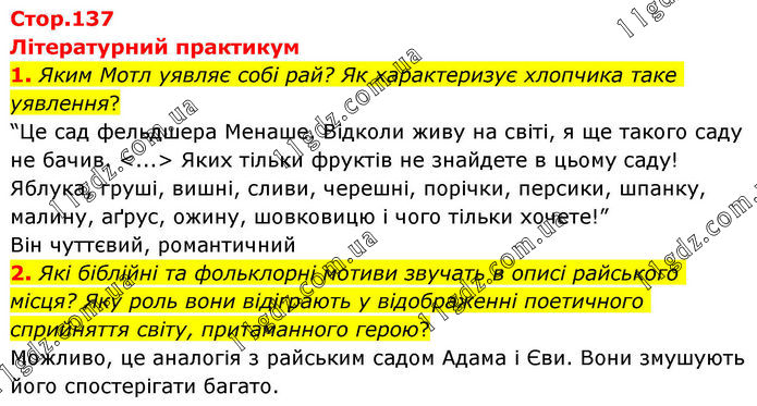 Літературний практикум 1. Яким Мотл уявляє собі рай? Як характеризує хлопчика таке уявлення? “Це сад фельдшера Менаше. Відколи живу на світі, я ще такого саду не бачив. <...> Яких тільки фруктів не знайдете в цьому саду! Яблука, груші, вишні, сливи, черешні, порічки, персики, шпанку, малину, аґрус, ожину, шовковицю і чого тільки хочете!” Він чуттєвий, романтичний 2. Які біблійні та фольклорні мотиви звучать в описі райського місця? Яку роль вони відіграють у відображенні поетичного сприйняття світу, притаманного герою? Можливо, це аналогія з райським садом Адама і Єви. Вони змушують його спостерігати багато.