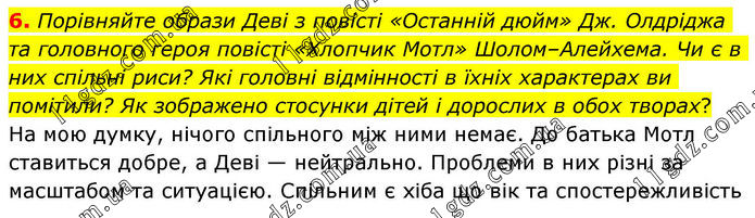 6. Порівняйте образи Деві з повісті «Останній дюйм» Дж. Олдріджа та головного героя повісті «Хлопчик Мотл» Шолом–Алейхема. Чи є в них спільні риси? Які головні відмінності в їхніх характерах ви помітили? Як зображено стосунки дітей і дорослих в обох творах? На мою думку, нічого спільного між ними немає. До батька Мотл ставиться добре, а Деві — нейтрально. Проблеми в них різні за масштабом та ситуацією. Спільним є хіба що вік та спостережливість.