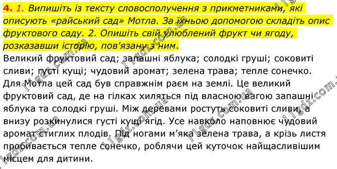4. 1. Випишіть із тексту словосполучення з прикметниками, які описують «райський сад» Мотла. За їхньою допомогою складіть опис фруктового саду. 2. Опишіть свій улюблений фрукт чи ягоду, розказавши історію, пов'язану з ним. Великий фруктовий сад; запашні яблука; солодкі груші; соковиті сливи; густі кущі; чудовий аромат; зелена трава; тепле сонечко. Для Мотла цей сад був справжнім раєм на землі. Це великий фруктовий сад, де на гілках хиляться під власною вагою запашні яблука та солодкі груші. Між деревами ростуть соковиті сливи, а внизу розкинулися густі кущі ягід. Усе навколо наповнює чудовий аромат стиглих плодів. Під ногами м’яка зелена трава, а крізь листя пробивається тепле сонечко, роблячи цей куточок найщасливішим місцем для дитини.