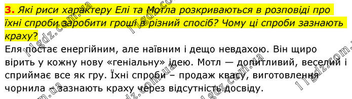 3. Які риси характеру Елі та Мотла розкриваються в розповіді про їхні спроби заробити гроші в різний спосіб? Чому ці спроби зазнають краху? Еля постає енергійним, але наївним і дещо невдахою. Він щиро вірить у кожну нову «геніальну» ідею. Мотл — допитливий, веселий і сприймає все як гру. Їхні спроби – продаж квасу, виготовлення чорнила – зазнають краху через відсутність досвіду.