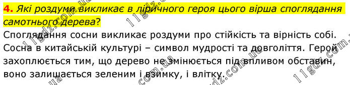 4. Які роздуми викликає в ліричного героя цього вірша споглядання самотнього дерева? Споглядання сосни викликає роздуми про стійкість та вірність собі. Сосна в китайській культурі – символ мудрості та довголіття. Герой захоплюється тим, що дерево не змінюється під впливом обставин, воно залишається зеленим і взимку, і влітку.