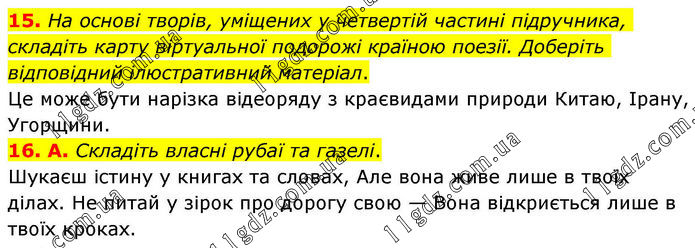 15. На основі творів, уміщених у четвертій частині підручника, складіть карту віртуальної подорожі країною поезії. Доберіть відповідний ілюстративний матеріал. Це може бути нарізка відеоряду з краєвидами природи Китаю, Ірану, Угорщини. 16. А. Складіть власні рубаї та газелі. Шукаєш істину у книгах та словах, Але вона живе лише в твоїх ділах. Не питай у зірок про дорогу свою — Вона відкриється лише в твоїх кроках.
