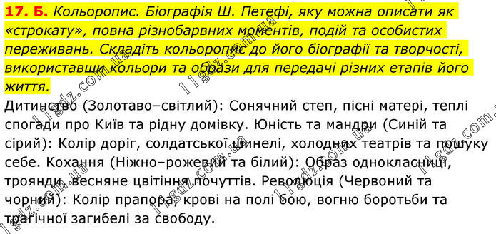 17. Б. Кольоропис. Біографія Ш. Петефі, яку можна описати як «строкату», повна різнобарвних моментів, подій та особистих переживань. Складіть кольоропис до його біографії та творчості, використавши кольори та образи для передачі різних етапів його життя. Дитинство (Золотаво–світлий): Сонячний степ, пісні матері, теплі спогади про Київ та рідну домівку. Юність та мандри (Синій та сірий): Колір доріг, солдатської шинелі, холодних театрів та пошуку себе. Кохання (Ніжно–рожевий та білий): Образ однокласниці, троянди, весняне цвітіння почуттів. Революція (Червоний та чорний): Колір прапора, крові на полі бою, вогню боротьби та трагічної загибелі за свободу.