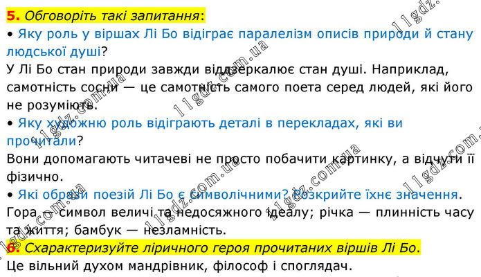 5. Обговоріть такі запитання: • Яку роль у віршах Лі Бо відіграє паралелізм описів природи й стану людської душі? У Лі Бо стан природи завжди віддзеркалює стан душі. Наприклад, самотність сосни — це самотність самого поета серед людей, які його не розуміють. • Яку художню роль відіграють деталі в перекладах, які ви прочитали? Вони допомагають читачеві не просто побачити картинку, а відчути її фізично. • Які образи поезій Лі Бо є символічними? Розкрийте їхнє значення. Гора — символ величі та недосяжного ідеалу; річка — плинність часу та життя; бамбук — незламність. 6. Схарактеризуйте ліричного героя прочитаних віршів Лі Бо. Це вільний духом мандрівник, філософ і споглядач.