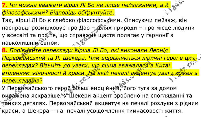 7. Чи можна вважати вірші Лі Бо не лише пейзажними, а й філософськими? Відповідь обґрунтуйте. Так, вірші Лі Бо є глибоко філософськими. Описуючи пейзаж, він насправді розмірковує про Дао – шлях природи – про місце людини у всесвіті та про те, що справжнє щастя полягає у гармонії з навколишнім світом. 8. Порівняйте переклади вірша Лі Бо, які виконали Леонід Первомайський та Я. Шекера. Чим відрізняються ліричні герої в цих перекладах? Візьміть до уваги, що яшма вважалася в Китаї втіленням жіночності й краси. На якій печалі акцентує увагу кожен з перекладачів? У Первомайського герой більш емоційний, його туга за домом виражена яскравіше. У Шекери акцент зроблено на спогляданні та тонких деталях. Первомайський акцентує на печалі розлуки з рідним краєм, а Шекера – на печалі усвідомлення тимчасовості життя.