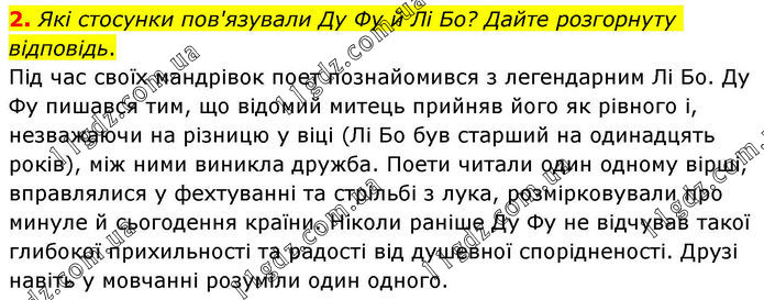 2. Які стосунки пов'язували Ду Фу й Лі Бо? Дайте розгорнуту відповідь. Під час своїх мандрівок поет познайомився з легендарним Лі Бо. Ду Фу пишався тим, що відомий митець прийняв його як рівного і, незважаючи на різницю у віці (Лі Бо був старший на одинадцять років), між ними виникла дружба. Поети читали один одному вірші, вправлялися у фехтуванні та стрільбі з лука, розмірковували про минуле й сьогодення країни. Ніколи раніше Ду Фу не відчував такої глибокої прихильності та радості від душевної спорідненості. Друзі навіть у мовчанні розуміли один одного.