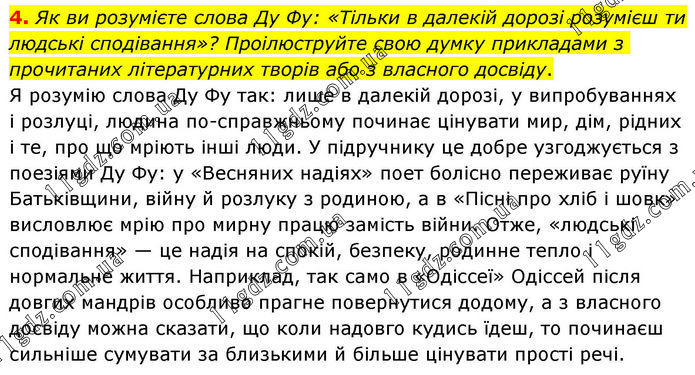 4. Як ви розумієте слова Ду Фу: «Тільки в далекій дорозі розумієш ти людські сподівання»? Проілюструйте свою думку прикладами з прочитаних літературних творів або з власного досвіду. Я розумію слова Ду Фу так: лише в далекій дорозі, у випробуваннях і розлуці, людина по-справжньому починає цінувати мир, дім, рідних і те, про що мріють інші люди. У підручнику це добре узгоджується з поезіями Ду Фу: у «Весняних надіях» поет болісно переживає руїну Батьківщини, війну й розлуку з родиною, а в «Пісні про хліб і шовк» висловлює мрію про мирну працю замість війни. Отже, «людські сподівання» — це надія на спокій, безпеку, родинне тепло і нормальне життя. Наприклад, так само в «Одіссеї» Одіссей після довгих мандрів особливо прагне повернутися додому, а з власного досвіду можна сказати, що коли надовго кудись їдеш, то починаєш сильніше сумувати за близькими й більше цінувати прості речі.