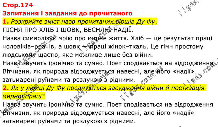 Запитання і завдання до прочитаного 1. Розкрийте зміст назв прочитаних віршів Ду Фу. ПІСНЯ ПРО ХЛІБ І ШОВК, ВЕСНЯНІ НАДІЇ. Назва символізує мрію про мирне життя. Хліб — це результат праці чоловіків–орачів, а шовк — праці жінок–ткаль. Це гімн простому людському щастю, яке можливе лише без війни. Назва звучить іронічно та сумно. Поет сподівається на відродження Вітчизни, як природа відроджується навесні, але його «надії» затьмарені руїнами та розлукою з рідними. 2. Як у ліриці Ду Фу поєднуються засудження війни й поетизація мирної праці? Назва звучить іронічно та сумно. Поет сподівається на відродження Вітчизни, як природа відроджується навесні, але його «надії» затьмарені руїнами та розлукою з рідними.