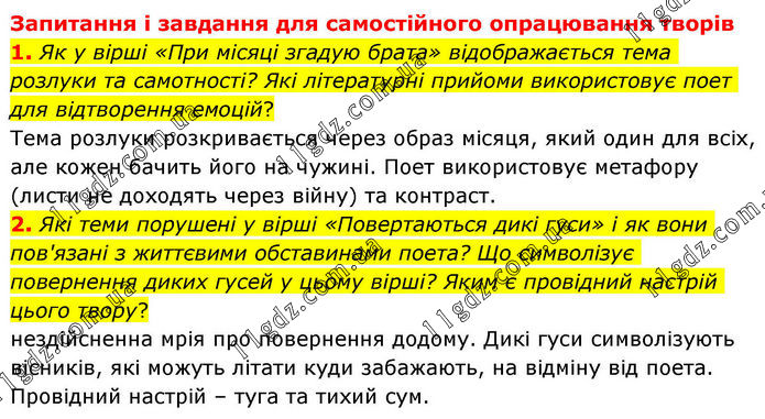 Запитання і завдання для самостійного опрацювання творів 1. Як у вірші «При місяці згадую брата» відображається тема розлуки та самотності? Які літературні прийоми використовує поет для відтворення емоцій? Тема розлуки розкривається через образ місяця, який один для всіх, але кожен бачить його на чужині. Поет використовує метафору (листи не доходять через війну) та контраст. 2. Які теми порушені у вірші «Повертаються дикі гуси» і як вони пов'язані з життєвими обставинами поета? Що символізує повернення диких гусей у цьому вірші? Яким є провідний настрій цього твору? Нездійсненна мрія про повернення додому. Дикі гуси символізують вісників, які можуть літати куди забажають, на відміну від поета. Провідний настрій – туга та тихий сум.