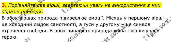 3. Порівняйте два вірші, звертаючи увагу на використання в них образів природи. В обох віршах природа підкреслює емоції. Місяць у першому вірші – це холодний свідок самотності, а гуси у другому – це символ втраченої свободи. В обох випадках природа жива і «співчуває» герою.