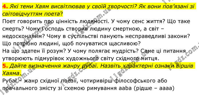 4. Які теми Хаям висвітлював у своїй творчості? Як вони пов’язані зі світовідчуттям поета? Поет говорить про цінність людяності. У чому сенс життя? Що таке смерть? Чому Господь створив людину смертною, а світ – недосконалим? Чому в суспільстві панують несправедливі закони? Що потрібно людині, щоб почуватися щасливою? На що здатен її розум? У чому полягає мудрість? Саме ці питання утворюють підмурівок художнього світу східного митця. 5. Дайте визначення жанру рубаї. Назвіть характерні ознаки віршів Хаяма. Рубаї – жанр східної поезії, чотиривірш філософського або повчального змісту зі схемою римування aaba (рідше – aaaa).