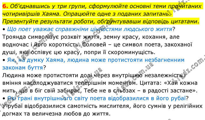 6. Об'єднавшись у три групи, сформулюйте основні теми прочитаних чотиривіршів Хаяма. Опрацюйте одне з поданих запитань. Презентуйте результати роботи, обґрунтувавши відповідь цитатами. • Що поет уважає справжніми цінностями людського життя? Троянда символізує розквіт життя, земну красу, кохання, але водночас і його короткість. Соловей – це символ поета, закоханої душі, яка оспівує цю красу, попри її скороминущість. • Як, на думку Хаяма, людина може протистояти незбагненним законам буття? Людина може протистояти долі через внутрішню незалежність і вміння насолоджуватися теперішнім моментом. Цитата: «Хай кожна мить, що в біг свій забирає, Тебе не в сльозах – в радості застане». • Які грані внутрішнього світу поета відобразилися в його рубаї? У рубаї відобразилися самотність мислителя, його сумнів у релігійних догмах та величезна любов до життя.