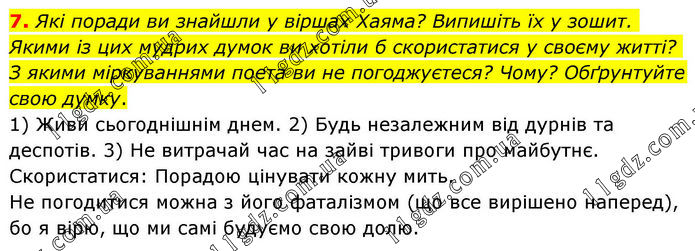 7. Які поради ви знайшли у віршах Хаяма? Випишіть їх у зошит. Якими із цих мудрих думок ви хотіли б скористатися у своєму житті? З якими міркуваннями поета ви не погоджуєтеся? Чому? Обґрунтуйте свою думку. 1) Живи сьогоднішнім днем. 2) Будь незалежним від дурнів та деспотів. 3) Не витрачай час на зайві тривоги про майбутнє. Скористатися: Порадою цінувати кожну мить. Не погодитися можна з його фаталізмом (що все вирішено наперед), бо я вірю, що ми самі будуємо свою долю.