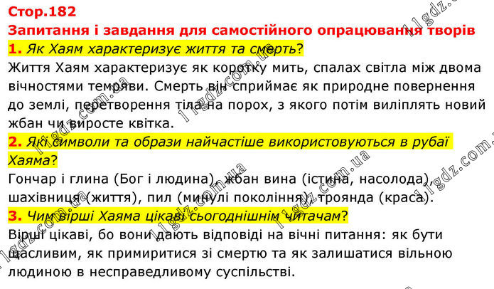 Запитання і завдання для самостійного опрацювання творів 1. Як Хаям характеризує життя та смерть? Життя Хаям характеризує як коротку мить, спалах світла між двома вічностями темряви. Смерть він сприймає як природне повернення до землі, перетворення тіла на порох, з якого потім виліплять новий жбан чи виросте квітка. 2. Які символи та образи найчастіше використовуються в рубаї Хаяма? Гончар і глина (Бог і людина), жбан вина (істина, насолода), шахівниця (життя), пил (минулі покоління), троянда (краса). 3. Чим вірші Хаяма цікаві сьогоднішнім читачам? Вірші цікаві, бо вони дають відповіді на вічні питання: як бути щасливим, як примиритися зі смертю та як залишатися вільною людиною в несправедливому суспільстві.