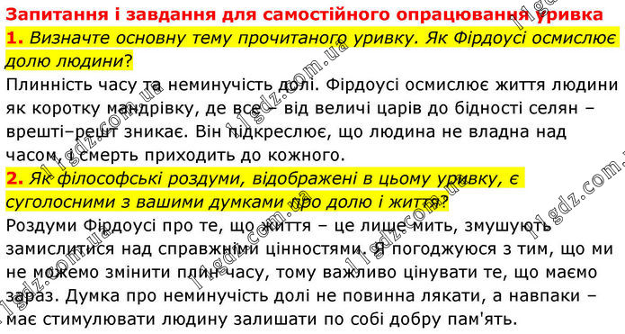 Запитання і завдання для самостійного опрацювання уривка 1. Визначте основну тему прочитаного уривку. Як Фірдоусі осмислює долю людини? Плинність часу та неминучість долі. Фірдоусі осмислює життя людини як коротку мандрівку, де все – від величі царів до бідності селян – врешті–решт зникає. Він підкреслює, що людина не владна над часом, і смерть приходить до кожного. 2. Як філософські роздуми, відображені в цьому уривку, є суголосними з вашими думками про долю і життя? Роздуми Фірдоусі про те, що життя – це лише мить, змушують замислитися над справжніми цінностями. Я погоджуюся з тим, що ми не можемо змінити плин часу, тому важливо цінувати те, що маємо зараз. Думка про неминучість долі не повинна лякати, а навпаки – має стимулювати людину залишати по собі добру пам'ять.