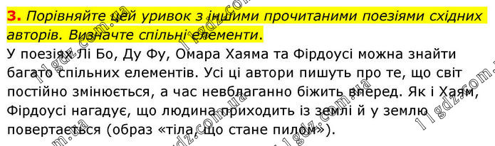3. Порівняйте цей уривок з іншими прочитаними поезіями східних авторів. Визначте спільні елементи. У поезіях Лі Бо, Ду Фу, Омара Хаяма та Фірдоусі можна знайти багато спільних елементів. Усі ці автори пишуть про те, що світ постійно змінюється, а час невблаганно біжить вперед. Як і Хаям, Фірдоусі нагадує, що людина приходить із землі й у землю повертається (образ «тіла, що стане пилом»).
