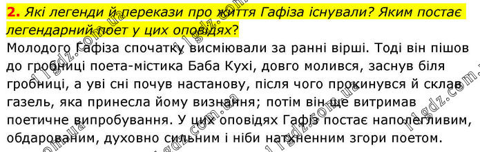2. Які легенди й перекази про життя Гафіза існували? Яким постає легендарний поет у цих оповідях? Молодого Гафіза спочатку висміювали за ранні вірші. Тоді він пішов до гробниці поета-містика Баба Кухі, довго молився, заснув біля гробниці, а уві сні почув настанову, після чого прокинувся й склав газель, яка принесла йому визнання; потім він ще витримав поетичне випробування. У цих оповідях Гафіз постає наполегливим, обдарованим, духовно сильним і ніби натхненним згори поетом.