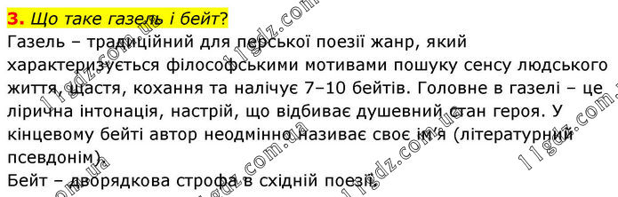 3. Що таке газель і бейт? Газель – традиційний для перської поезії жанр, який характеризується філософськими мотивами пошуку сенсу людського життя, щастя, кохання та налічує 7–10 бейтів. Головне в газелі – це лірична інтонація, настрій, що відбиває душевний стан героя. У кінцевому бейті автор неодмінно називає своє ім’я (літературний псевдонім). Бейт – дворядкова строфа в східній поезії.