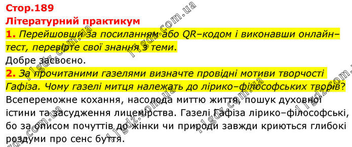 Літературний практикум 1. Перейшовши за посиланням або QR–кодом і виконавши онлайн–тест, перевірте свої знання з теми. Добре засвоєно. 2. За прочитаними газелями визначте провідні мотиви творчості Гафіза. Чому газелі митця належать до лірико–філософських творів? Всепереможне кохання, насолода миттю життя, пошук духовної істини та засудження лицемірства. Газелі Гафіза лірико–філософські, бо за описом почуттів до жінки чи природи завжди криються глибокі роздуми про сенс буття.